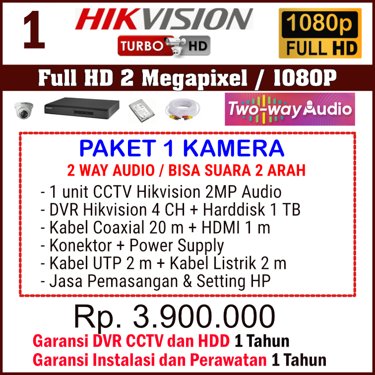 Paket CCTV Hikvision dengan resolusi 2 Megapixel dengan kemampuan merekam dan mengeluarkan suara. Dilengkapi dengan built in Microphonde dan Speaker sehingga bisa menangkap suara pada jarak kurang lebih hingga 3-5 meter.